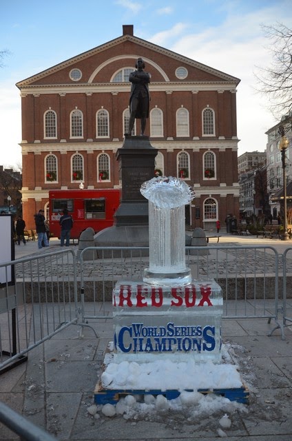 In front of the hall is the statue of Samuel Adams and right in front of it is an ice carving that states "Red Sox, World Series Champions" as a banner for their Major League Baseball title of Boston Red Sox.