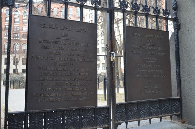 Nearby, walking distance, is the Granary Burial Ground. Referred to also as the Granary Burying Ground, the cemetery is a burial site for a number of key names in American history, such as those who signed the Declaration of Independence (Sam Adams, John Hancock and Robert Treat Paine).